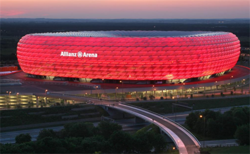 安联球场以精巧的结构、壮丽的外观,成为慕尼黑乃至德国的荣耀。体育场的表面由透明的菱形膜结构构成,使用的是ETFE环保膜材,在阳光的照耀下微微泛光,到了夜晚,通过灯光的映射,又能呈现红蓝两色,有种魔幻的视觉效果。