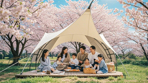 在悠闲自得的野餐时光里,遮阳膜结构不仅提供了必要的遮阳避雨功能,更成为了社交互动的绝佳场所。家人朋友围坐膜结构建筑下方,享受美食,畅谈笑语,春日的美好在此刻凝聚。