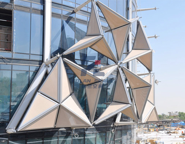 每个遮阳伞采用PTFE网格膜结构,由PTFE膜、三角形铝框、Y型支撑大臂、铸件、电机五大部分组成。6个覆盖PTFE膜的三角形铝框两两固定在Y型支撑大臂上,中间由柱形电机连接,在电控系统的控制下,实现自动开闭。