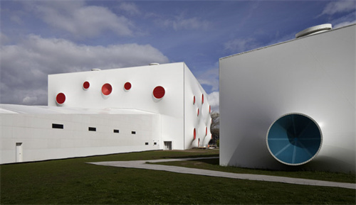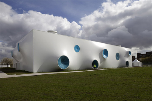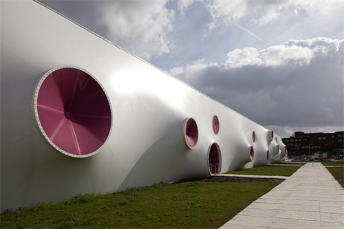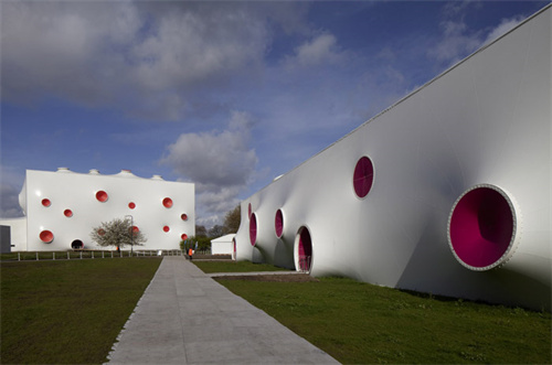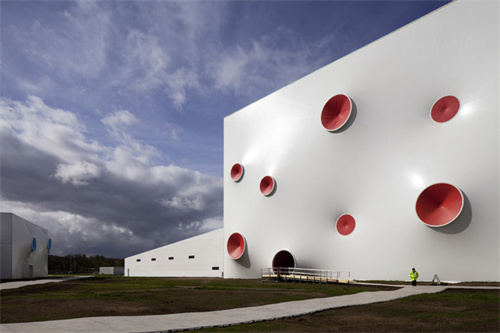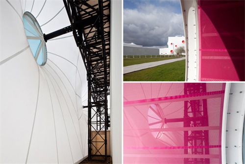 白色的膜外皮上面点缀着彩色的开口,这些开口是节点,也可以消解风压,并为场地通风,也有的充当着场地的出口。