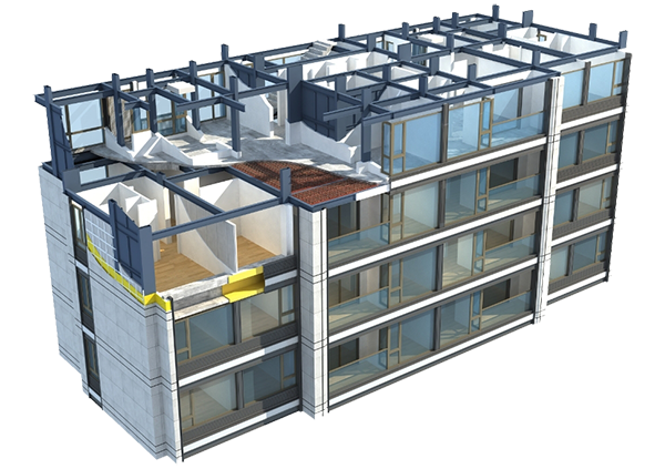 隐式框架钢结构住宅体系构件隐藏于主要建筑墙体内,室内无凸梁凸柱,钢构件随建筑墙体的走向灵活布置,适应住宅建筑通风采光、全明户型、室内流线优化的布局要求,能同时满足大跨度、大空间、户型可变性、高得房率等性能条件。同时,钢结构延伸性好,在地震下能耗散和吸收较多的能量,降低脆性破坏的危险程度,是国际公认的抗震性能最好的建筑体系。